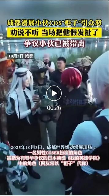 10月3日,多名网友发布视频显示,成都世界线动漫展,一名男性COSER扮演的角色被指为有辱华争议的日本动漫《我的英雄学院》中的角色(网友常以“柜子”代称),现场其他观众发现后先是劝说其取下假发劝说无效后,一名白衣男子从后方冲上前扯掉了该COSER的假发,引发后续推搡和混乱。